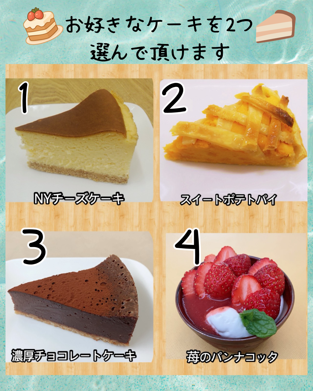 今回は写真の4種類のケーキからお好きなものを2種類事前に選んで頂きます。