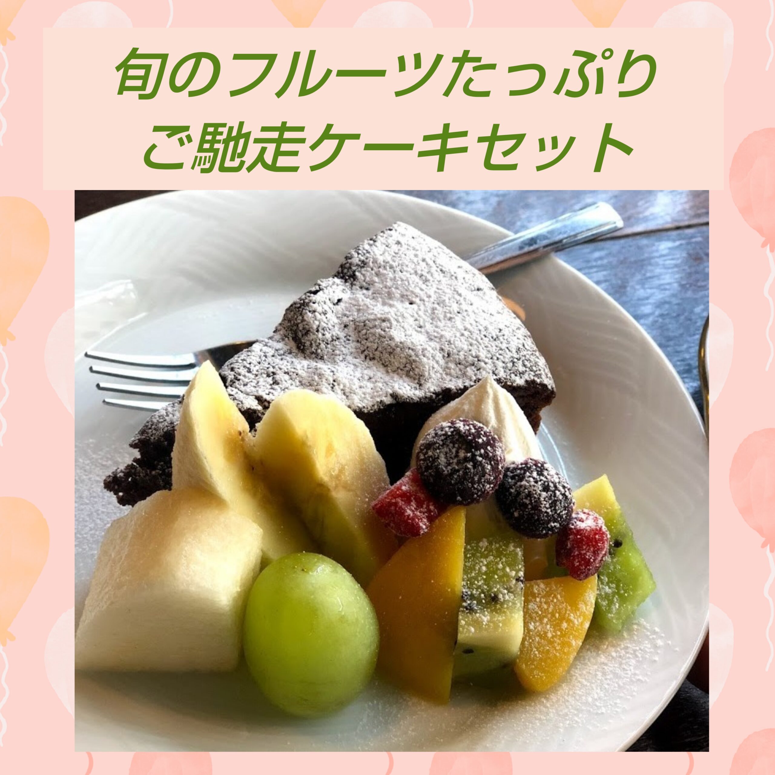 旬のフルーツがたくさん載った手作りケーキとソフトドリンクのセット